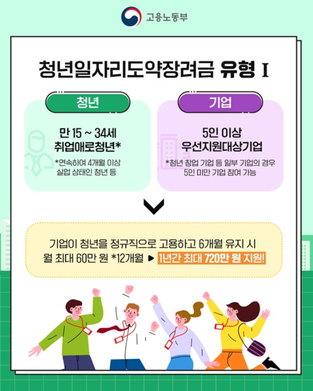 유형 I은 5인 이상의 기업이 취업애로청년을 정규직으로 채용할 경우 지원되는 프로그램입니다. 이 유형은 청년들이 안정적으로 일자리를 찾을 수 있도록 돕기 위해 마련되었습니다. 기업이 청년을 채용하고 6개월 이상 고용을 유지할 경우, 최대 720만 원의 지원금을 받을 수 있습니다.